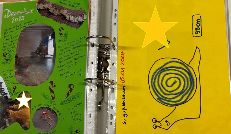 Im Portfolio dokumentieren die pädagogischen Fachkräfte mit Fotos, Berichten, Zeichnungen, Aktivitäten usw. die Entwicklung jedes einzelnen Kindes. Die Portfolios sind für Kinder und Eltern jederzeit einsehbar.